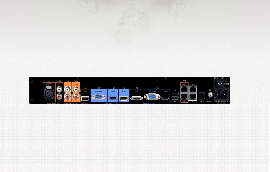 VGA環回:本地會議和視頻會議共用一個VGA接口,視頻會議終端關機狀態下,無需插拔VGA線纜,本地數據共享正常。