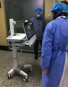 在病房區(qū)域,部署集成 DX80 的移動(dòng)推車,通過 Wifi 連接可以非常方便地實(shí)施現(xiàn)場(chǎng)指導(dǎo)。