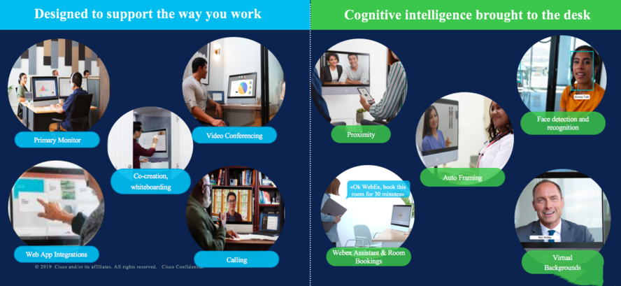 • 與以前的型號相比,Webex Desk Pro具有面部識別和人工智能等新功能。通過這種方式,它可以知道誰在設備前面,并可以通過其名字與該人聯(lián)系。